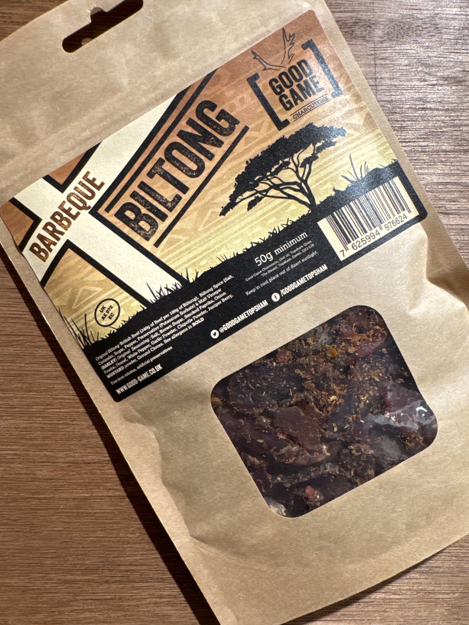 Ingredients: Bristish Beef (240g of beef per 100g of biltong) BIltong spice (Salt, Coriander, Sugar, Pepper)