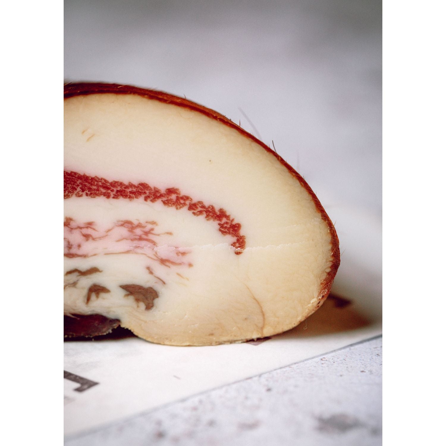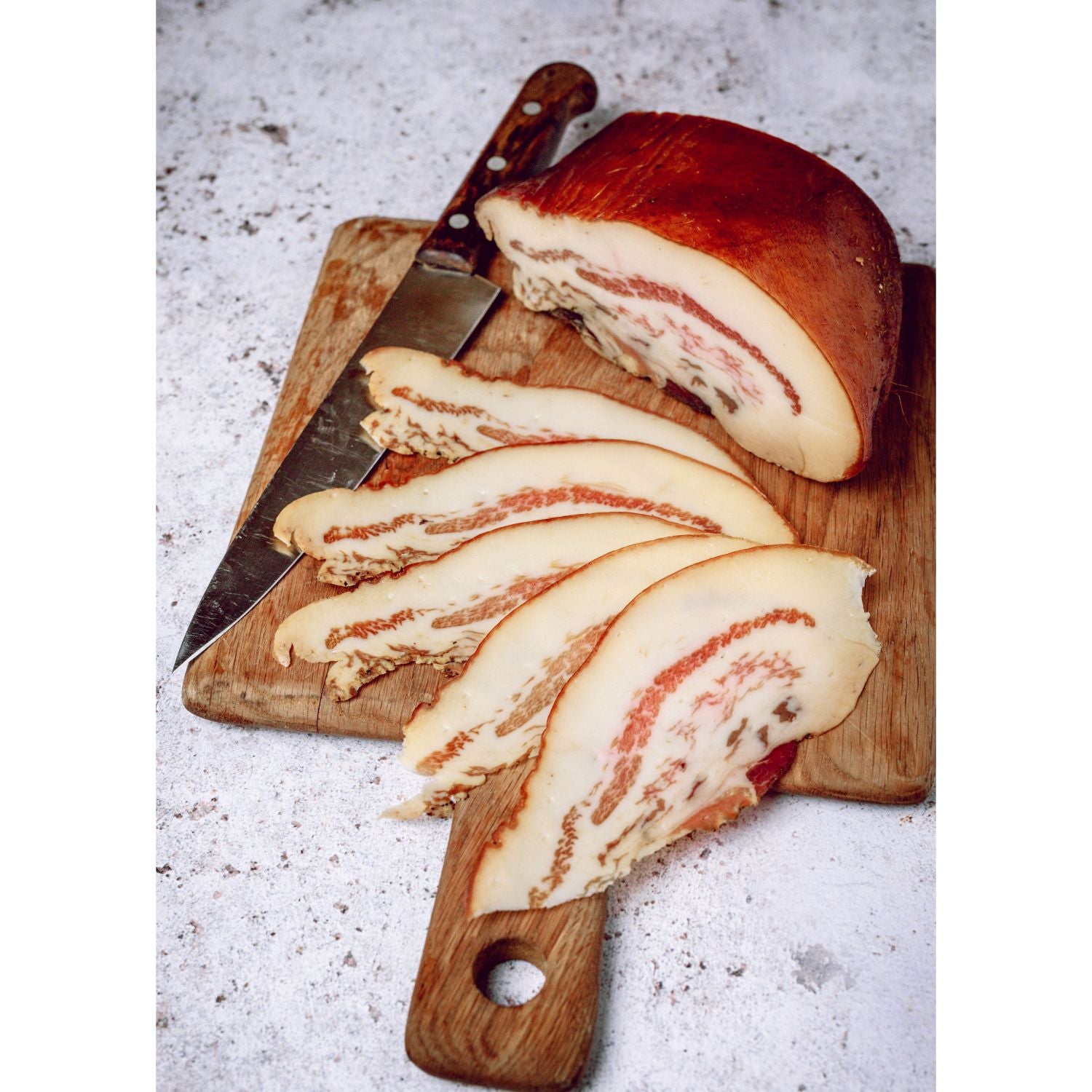 Description – This is a classic Italian style air dried pork cheek, like face bacon you can eat raw. Dry cured then hung for at least 8 weeks.